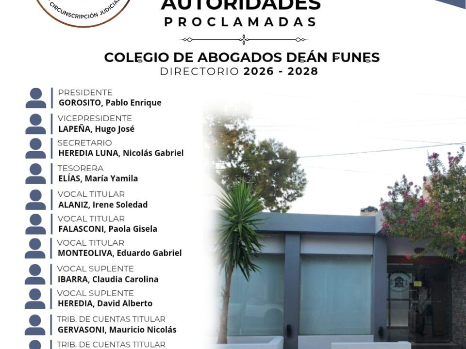 El Colegio de Abogados de Dean Funes es una institución comprometida con la excelencia en el ejercicio del derecho y la defensa de los valores jurídicos. Nuestra misión es brindar apoyo, formación y representación a los profesionales del derecho, fomentando la ética, la justicia y el desarrollo de la comunidad legal en la región. Trabajamos para fortalecer los vínculos entre los abogados y la sociedad, promoviendo el acceso a la justicia y el respeto por el estado de derecho.